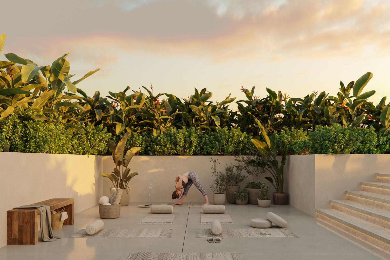 Among its amenities, it has a rooftop pool, a place to relax while enjoying sweeping views of the surroundings. It also has a yoga area, a space designed for those seeking moments of well-being in a serene environment.